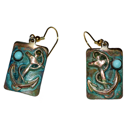 2023 Anchors Aweigh Verdigris Patina Brass Rectangle Anchor Dangle Earrings - Turquoise