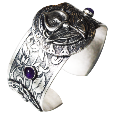 Antique Silver Calla Lily Cuff Bracelet - Amethyst and Chariote