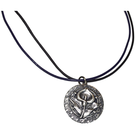 Antique Silver Calla Lily Pendant - Violet and Black Dual Rawhide Leather Necklace