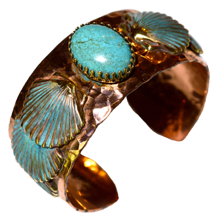 Copper and Patina Brass NeoOceania Overlapping Scallop Shells Cuff - Nevada Turquoise