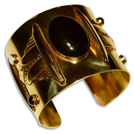 • Mirror Antique Brass Art Deco Wide Cuff Bracelet - Black Onyx, MOP