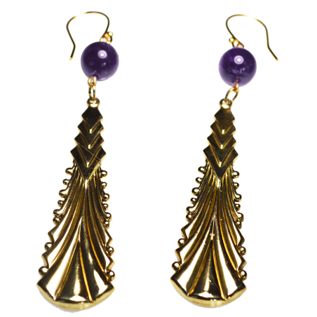 Art Deco 2022 Mirror Long Brass Earrings - Amethyst