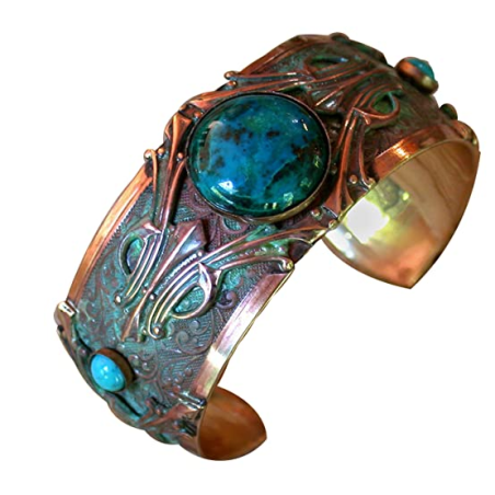 Elaine Coyne Wearable Art Patina Art Deco Motif Cuff Bracelet - Chrysocolla