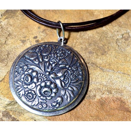 Mirror Antique Silver Brass Butterfly and Floral Pendant on Rawhide