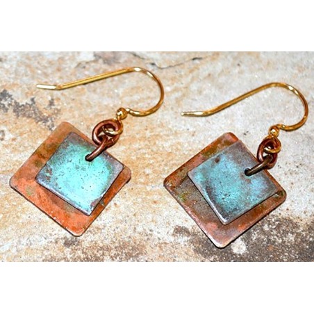 Verdigris and Earth Patina Solid Brass Bohemian Chic Overlapping Squares Dangle Earrings