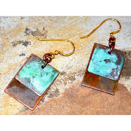 Verdigris and Earth Patina Solid Brass Bohemian Chic Overlapping Rectangle Dangle Earrings
