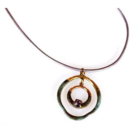 • Verdigris Patina Solid Brass Double Asymmetrical Sculptural Circle Pendant - Violette Opal European Crystal