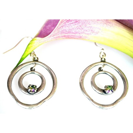 • Double Asymmetrical Open Circle Dangle Earrings in Mirror Antiqued Silver Plate Solid Brass with European Crystals.