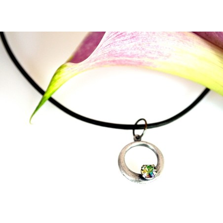Mirror Antiqued Silver Brass Small Asymmetrical Sculptural Circle Pendant on Rawhide - Swarovski Crystal