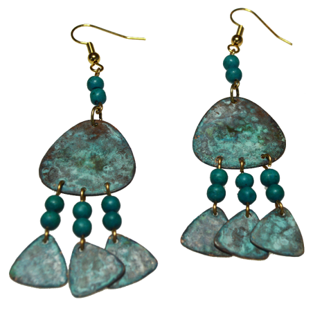 2023 Modern Southwest Verdigris Patina Brass Triple Dangle Triangle Earrings - Turquoise