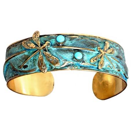 • Dragonflies on Feather Nature Motif Cuff in our signature Verdigris Patina Solid Brass shown with genuine Turquoise.