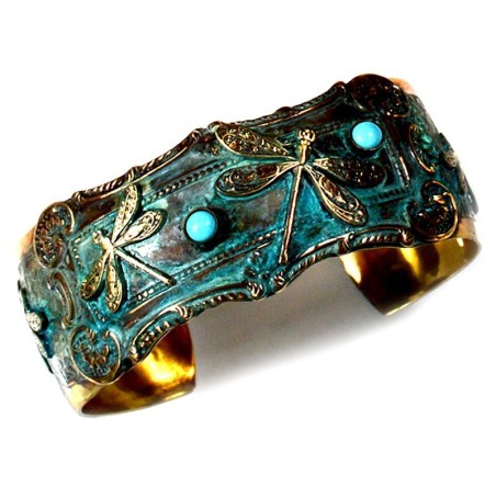 Verdigris Patina Brass Victorian Dragonflies Cuff - Turquoise