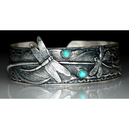 Antiqued Silver Solid Brass Dragonflies on Feather Cuff - Turquoise