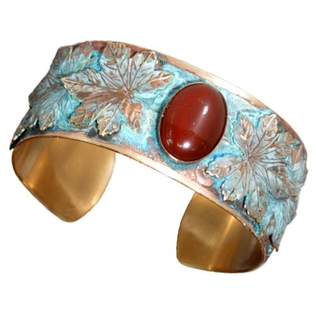 Verdigris Patina Solid Brass Overlapping Maple Leaves Cuff Bracelet - Carnelian