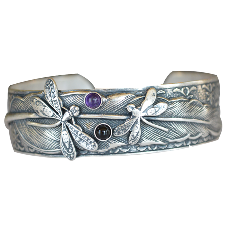 Mirror Antique Silver Dragonflies on Feather Cuff - Amethyst, Black Onyx