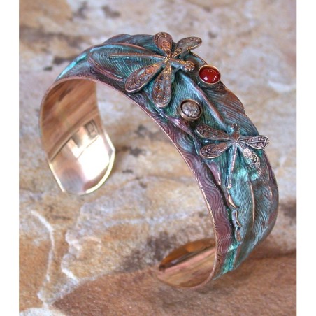Verdigris Patina Solid Brass Dragonflies on Feather Cuff - Turquoise, Carnelian