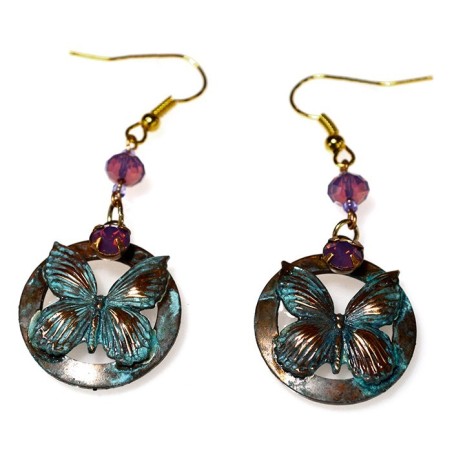 • Delicate Butterfly on Open Circle Dangle Earrings in Solid Brass with our unique, hand applied Verdigris Patina with Violette Opal European Crystals.