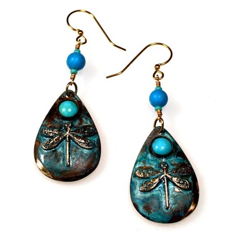 Verdigris Patina Solid Brass Dragonfly Teardrop Earrings - Turquoise