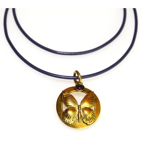 • Butterfly Pendant in Satin Antiqued Gold Plate Solid Brass with Amethyst Cabochon, on Lavender Rawhide.