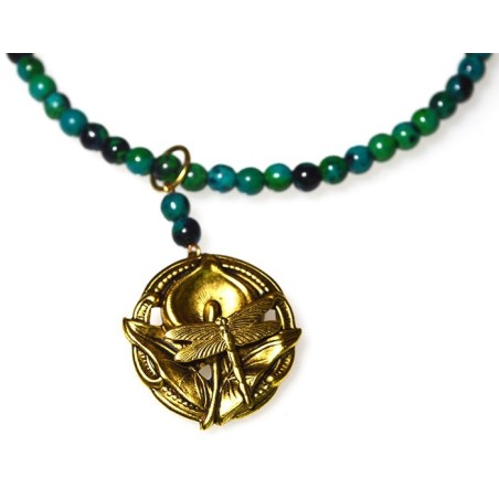 • An intricate Dragonfly rests on a Calla Lily in this unique Nature Motif Pendant in Antique Gold Brass on Chrysocolla beading.
