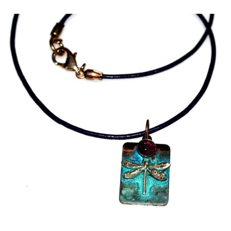 Verdigris Patina Solid Brass Dragonfly On Rectangle Pendant - Amethyst