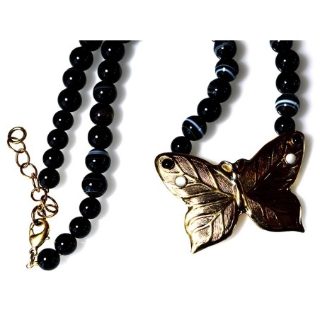 Mirror Solid Brass Butterfly Necklace - Mother of Pearl, Black Onyx, Sardonyx