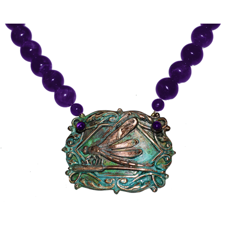 Verdigris Patina Victorean Dragonfly on Cattail Pendant - Amethyst