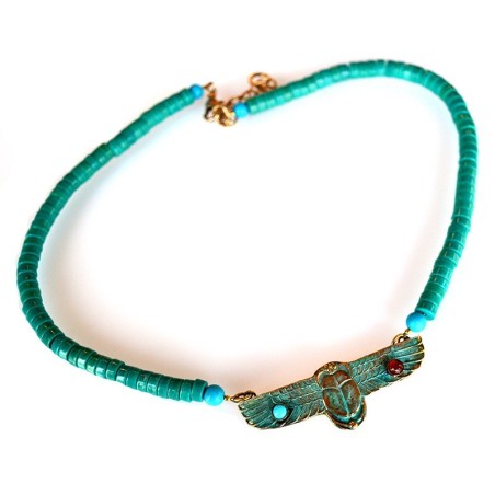 Verdigris Patina Solid Brass Egyptian Motif Winged Scarab Necklace - Carnelian, Turquoise
