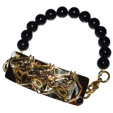 Unisex Equestrian Curved Mirror Brass Rectangle Horse Head Rockband - Black Onyx and Mother of Pearl