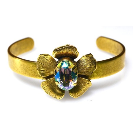 • A Flower on a 3/8" Cuff in Satin Antiqued Gold Plate Solid Brass, with a Paradise European Crystal