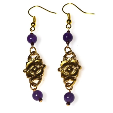 • Floral earrings in Antique Gold Brass with Amethyst beads.