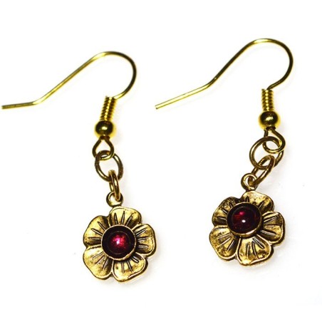 • Floral earrings in Antique Gold Brass with Garnet Cabochons.