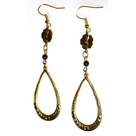 • Floral Dangle Earrings in Antiqued Gold Brass with Garnet Beads.