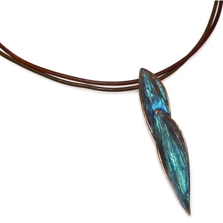 Verdigris Patina Contemporary Overlapping Leaves Pendant on Rawhide