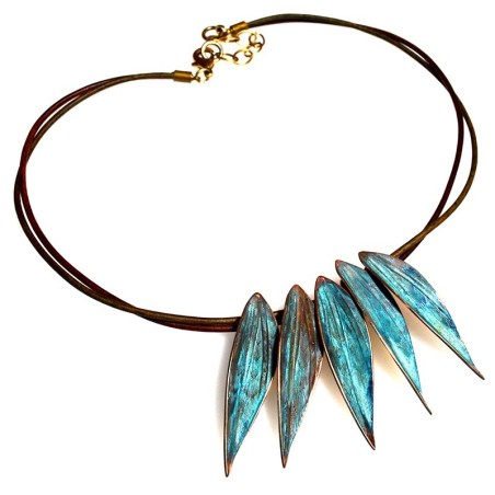 Verdigris Patina Contemporary Leaves Necklace on Dual Rawhide