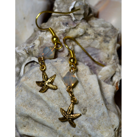 Antique Gold Starfish Dangle Earrings - Sand Opal Crystals