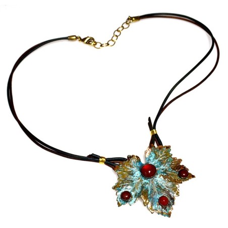 Olive Patina Brass Maple Leaf Pendant - Carnelian, Jasper