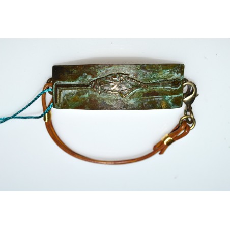 An Equestrian motif Rockband style Bracelet featuring a Horse Head and Polo Stick in Solid Brass with our unique multi-tone Olive Patina, shown on Natural Rawhide with Gold Filled Wire Wrap.