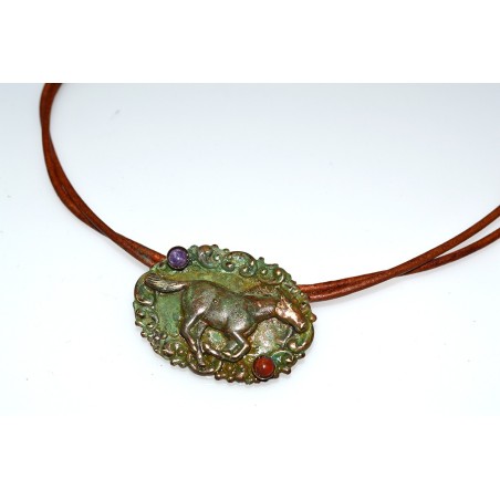 A Solid Brass Equestrian Galloping Wild Horse Pendant on a Floral background in our exclusive Earth Patina finish with genuine Charoite and Jasper cabochons.