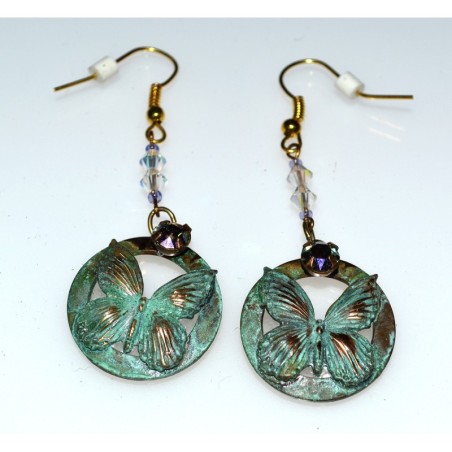 Delicate Butterfly on Open Circle Dangle Earrings in Solid Brass with our unique, hand applied Verdigris Patina with Tanzanite and Clear European Crystals.