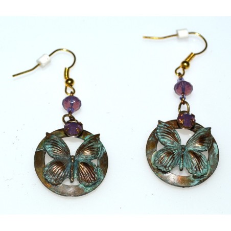 Verdigris Patina Solid Brass Delicate Butterfly on Circle Earrings - Violette Opal Crystalss - European Crystals