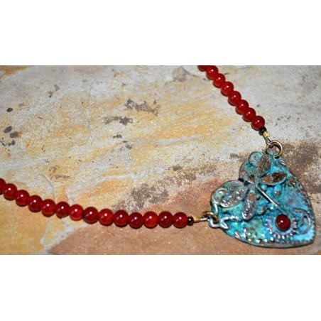 A Neo-Victorian Dragonfly Necklace inspired by nature as it met the Industrial Revolution featuring Authentic Vintage Watch Gears and scrolling Filigree work in our one-of-a-kind coloration Verdigris Patina Solid Brass with a genuine Carnelian Cabochon and 4mm Round Carnelian Beading.