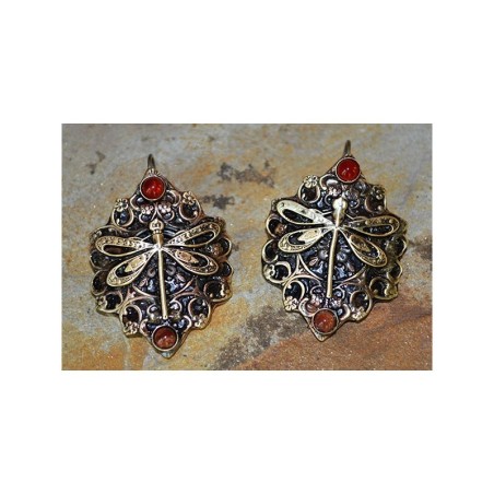 Open Filigree Dragonflies on Elaborate Victorian influenced Filigree Work in hand finished Satin Antiqued Solid Brass with genuine Carnelian and Jasper Cabochons.