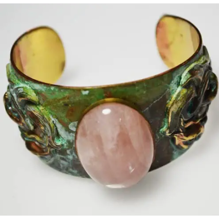 Verdigris Patina Brass Art Nouveau Calla Lily Graduated Cuff with Rose Quartz