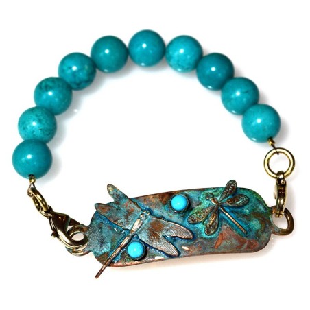 Verdigris Patina Brass Dragonflies Rockband Bracelet - Turquoise