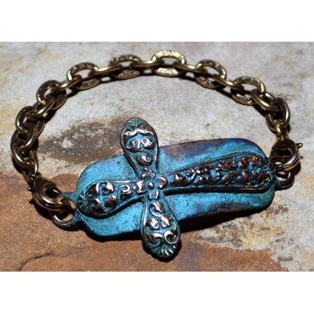 Men's Verdigris Patina Brass Decorative Cross Rockband Bracelet - Scroll Chain