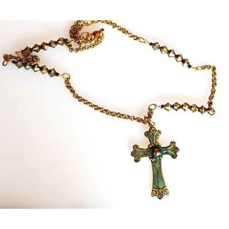 Verdigris Patina Brass Small Decorative Cross Necklace - Swarovski Crystals