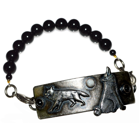 2023 Antique Silver Plated Brass Tri Stone Wolf Rockband - Hematite, Mother of Pearl, Black Onyx