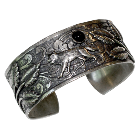 2023 Antique Silver Plated Brass Wolf Cuff - Black Onyx and Hematite