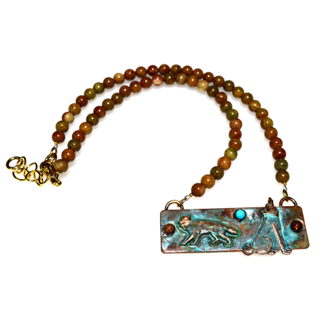 2023 Verdigris Patina Brass Tri Stone Wolf Pendant - Jasper and Turquoise